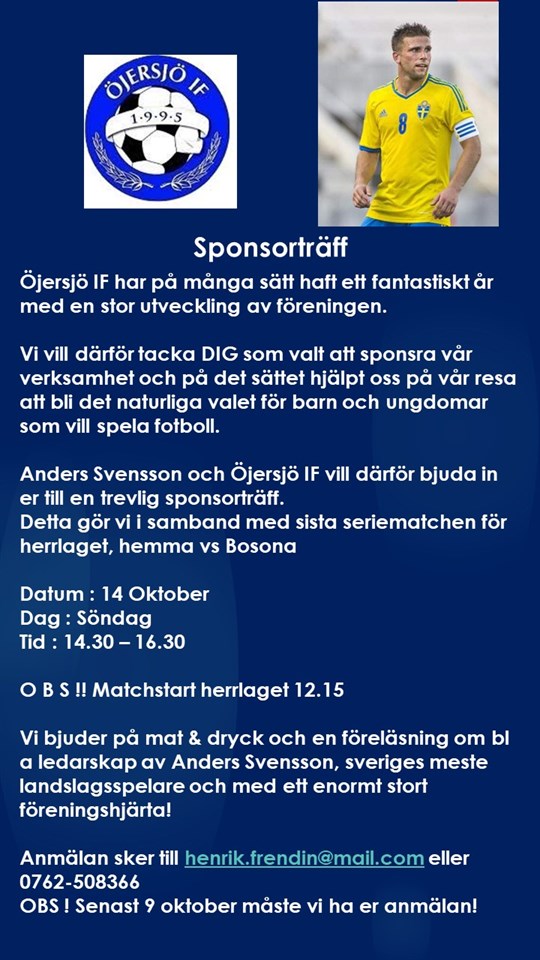 Hej Vi vill tacka för året som varit (fortfarande är) och bjuda in våra sponsorer och blivande sponsorer till en trevlig dag i klubbhuset. Söndag 14 oktober 14.30-16.30 bjuder vi på lite mat och dryck i samband med herrlagets sista hemmamatch, mot Bosona, för året. Anmälan sker genom mail till mig på henrik.frendin@mail.com Senast 9 oktober måste vi ha er anmälan. Öjersjö IF 1 okt 2018 0kommentarer