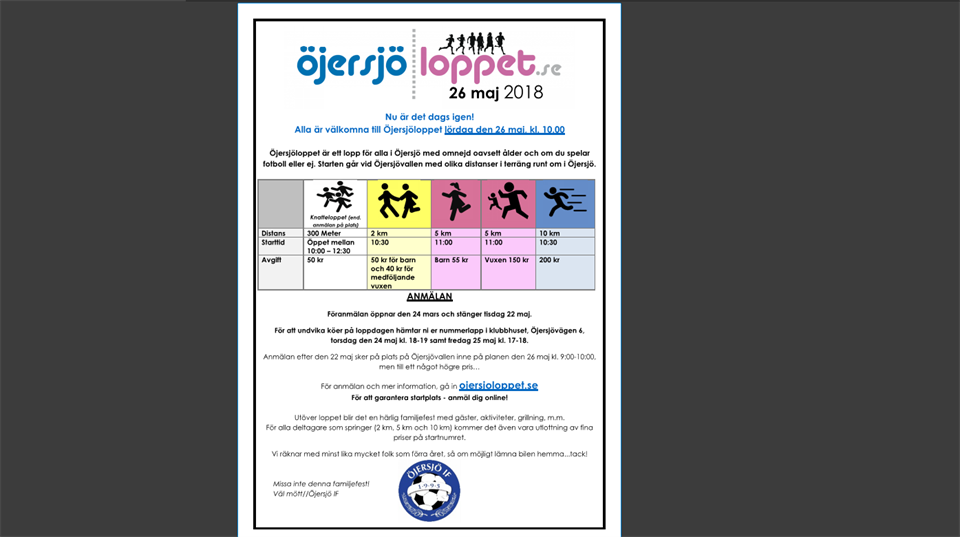 Nu är det dags igen! Alla är välkomna till Öjersjö IP lördag den 26 maj, kl. 10.00 Öjersjöloppet är ett lopp för alla i Öjersjö med omnejd oavsett ålder och om du spelar fotboll eller ej. Starten går vid Öjersjövallen med olika distanser i terräng runt om i Öjersjö. ANMÄLAN Föranmälan öppnar den 24 mars och stänger tisdag 22 maj. För att undvika köer på loppdagen hämtar ni er nummerlapp i klubbhuset, Öjersjövägen 6, torsdag den 24 maj kl. 18-19 samt fredag 25 maj kl. 17-18. Anmälan efter den 22 maj sker på plats på Öjersjövallen inne på planen den 26 maj kl. 9:00-10:00, men till ett något högre pris… För anmälan och mer information, gå in ojersjoloppet.se För att garantera startplats - anmäl dig online! Utöver loppet blir det en härlig familjefest med gäster, aktiviteter, grillning, m.m. Första start kommer att vara klockan 10:30 och sista 11:00. Café, popcornstationen samt aktiviteter öppnar kl. 9.30! För alla deltagare som springer (2 km, 5 km och 10 km) kommer det även vara utlottning av fina priser på startnumret. Vi räknar med minst lika mycket folk som förra året, så om möjligt lämna bilen hemma...tack! Anmäl dig här Missa inte denna familjefest! Väl mött//Öjersjö IF