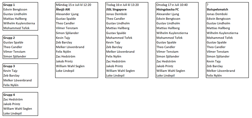 Hej, Tack för bra hejande idag. Riktigt bra!!! Det var inte långt ifrån att vi kom ikapp. Man skall aldrig ge upp! (som Håkan sa!) Här kommer lite information: - För er som vill och kan så skall vi kolla B17 IFK Göteborg - Avai FC på SKF Arena (Stora arenan på Heden). Vi samlas så ses vi utanför informationen på heden kl 17:30. Detta event kostar inget, så om några andra medföljare - För de som kommer vara hungriga efter matchen , så kommer vi gå till något hamburgerställe . BK, Donken, Max (Röstning i halvtid på matchen). Betalning till maten får alla lösa själva. - Efter maten går vi mot Ullevi (Nya...gamla...ja, den Stora Arenan) för att gå på Gothia Cup invigningen. Vi möter upp de killar som inte tänkte vara med på IFK-matchen på Heden kl 19:40 vid Ingemar Johansson-statyn. Vi har köpt biljetter till de killar som aviserat att de skall vara med (Alla utom Mattias, Wille, Gustav Li, Edde). - Vi skickar ut på i vår FB-grupp när vi tror att invigningen närmar sig sitt slut. Det står att den är 2 timmar lång och börjar 20:00, men vi försöker uppdatera löpande. - Imorgon är det frukost i klubbstugan kl 10:00. Vi äter frukost och sedan samlas vi och snackar igenom matchen. Då laddar vi för att möte gruppledaren JSSL Singapore som precis slog Hisingsbacka FC i första matchen. Vi åker mot Grimbovallen någon gång efter 11. Vi har ingen stress. Matchen startar kl 13:20.